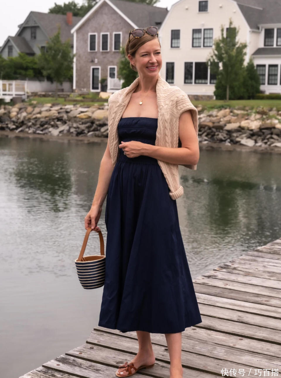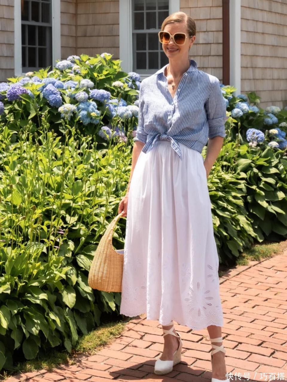二,中年女性要想保证度假风单品精致体面的上身效果,还需要认真挑选单品版型,以合身但不紧身的上身效果最佳,追求舒适放松感,但又不会完全松垮没型,简单耐看。
