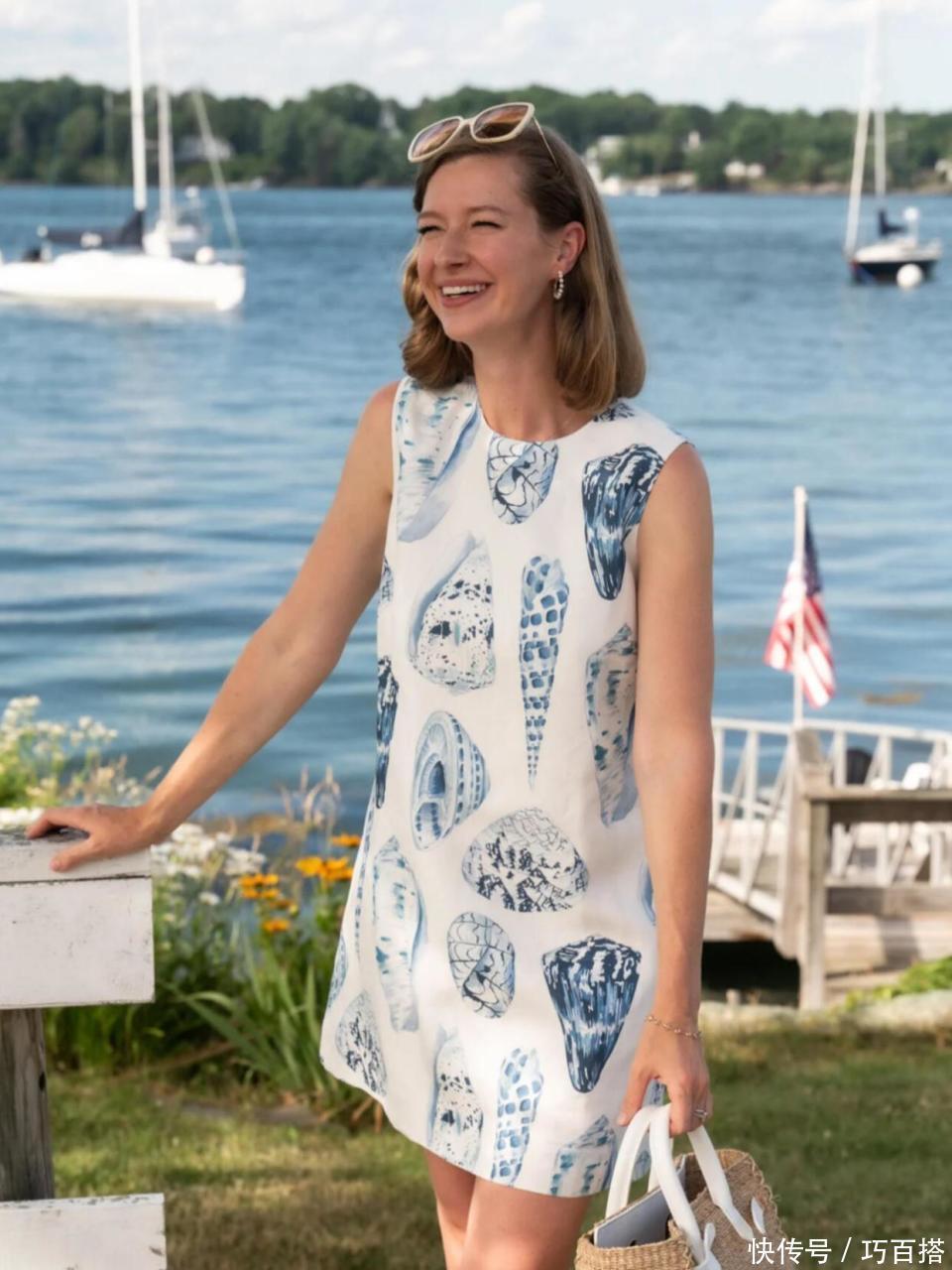 五,如果大家感觉基础纯色度假风单品过于单调,也可以选择优雅印花类单品,大家在选择时,可以以花色清晰、图案大小适中、配色和谐的印花,博主身上这类以不同饱和度的蓝色系构成的印花连衣裙,氛围也很出众。