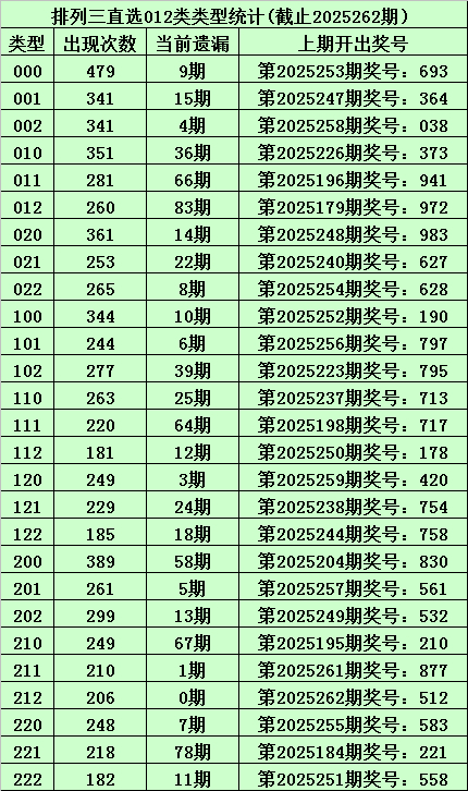 上期回顾:体彩排列三第2025262期开出奖号:512,其012路比为0:1:2,奖号012路类型为:212。